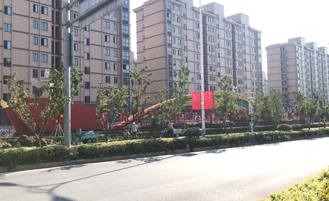 近期,走在道路上,園區(qū)居民會發(fā)現(xiàn)青海湖西路東入口南側(cè)設(shè)置一座建國70周年景觀雕塑,同時道路兩側(cè)路燈桿件懸掛國旗、中國結(jié)和70周年標(biāo)識的中國結(jié)等各式各樣的節(jié)日氛圍。