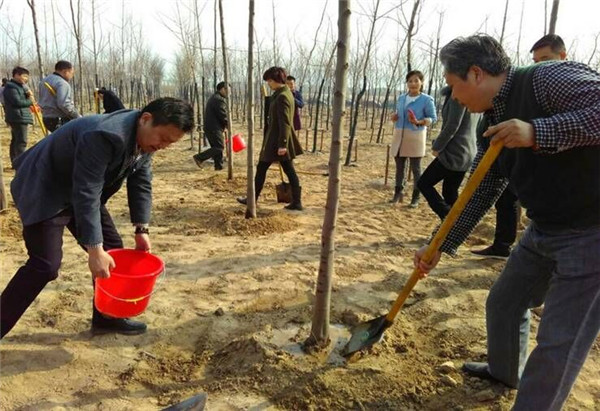 植樹過程中,參加植樹的人員個個熱情高漲、干勁十足,他們幾個人一組,扶直樹苗、揮鍬培土、踩實壓緊,不時還向身邊的園林綠化技術(shù)指導(dǎo)人員討教樹木種植、養(yǎng)護(hù)知識,整個勞動場面繁忙而有序。