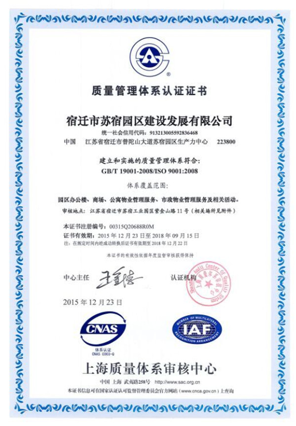 近期,園區(qū)建發(fā)公司正式獲得由上海質(zhì)量認證中心頒發(fā)的ISO9001質(zhì)量管理體系認證證書。